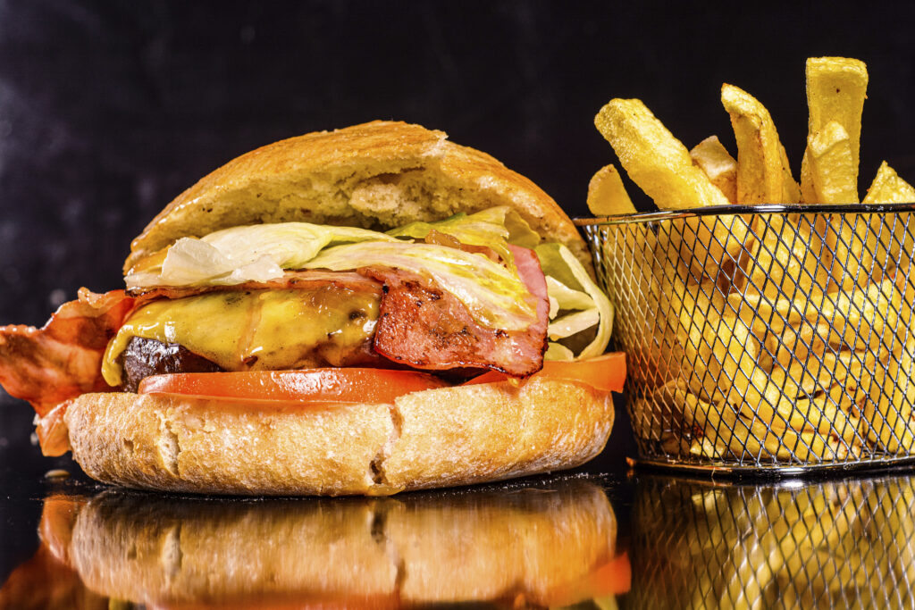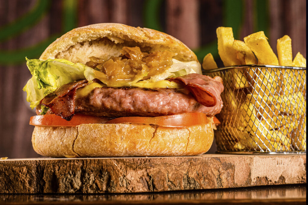 Carne de Ternera, Tomate, Lechuga, Bacon, Queso Fundido, Cebolla Caramelizada y Guarnición de Patatas