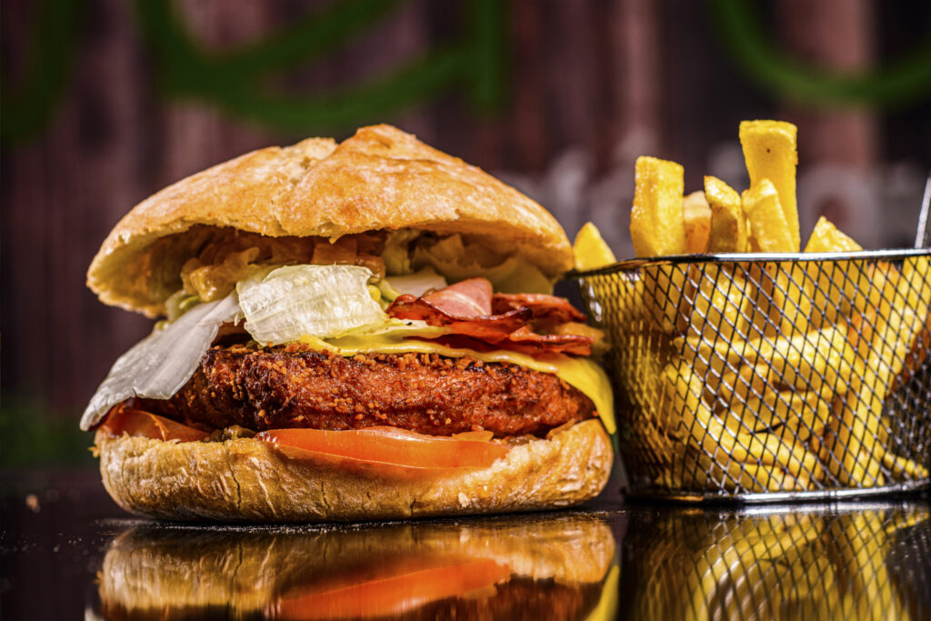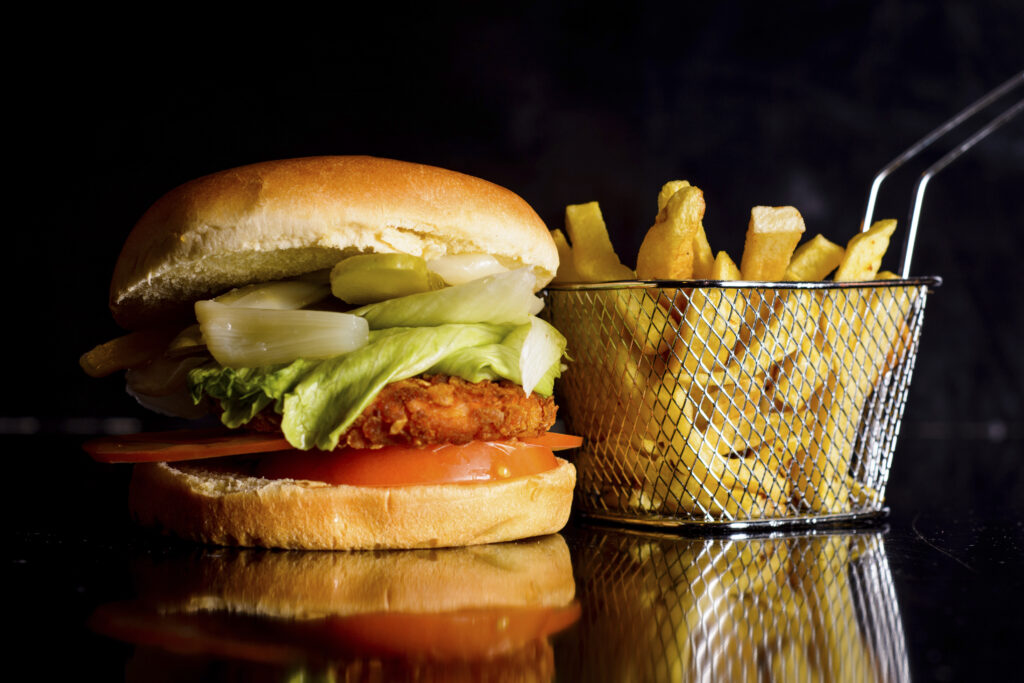 Burguer de Guisantes, Haba, Remolacha, Zanahoria, Pimiento, Manzana, Lechuga, Espárragos, Pepinillo, Guarnición de Patatas Fritas